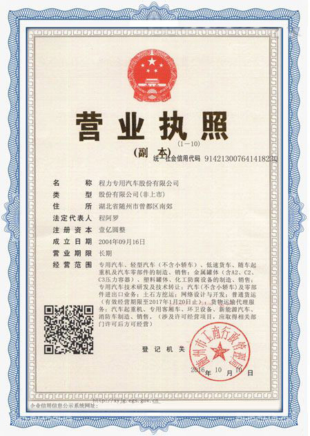 程力專用汽車股份有限公司各類專用汽車的專業(yè)廠家,大型專用汽車廠。國內(nèi)園林綠化、石油化工、市政環(huán)衛(wèi)、壓力容器專用汽車商。注冊“程力威”牌,產(chǎn)品代碼:“CLW”。東風(fēng)、解放、福田、重汽、陜汽、北奔等公司的重要合作伙伴,主要從事各類專用汽車的業(yè)務(wù),同時也銷售各大型廠家的整車及配件。公司擁有自行出口權(quán),其主導(dǎo)品種有灑水車系列、吸污(吸糞)車系列、垃圾車系列、掃地車系列、油罐加(運(yùn))油車系列、高空作業(yè)車系列、清障車系列、隨車吊系列、自卸車系列、教練車系列、半掛車系列、化工車系列、消防車系列、廂式(冷藏車)系列、牽引車系列、粉粒物料車系列、攪拌車系列、壓力容器系列、專用車配件等十八大系列300多個品種車型。同時批發(fā)東風(fēng)、解放、楚風(fēng)各種二類底盤。